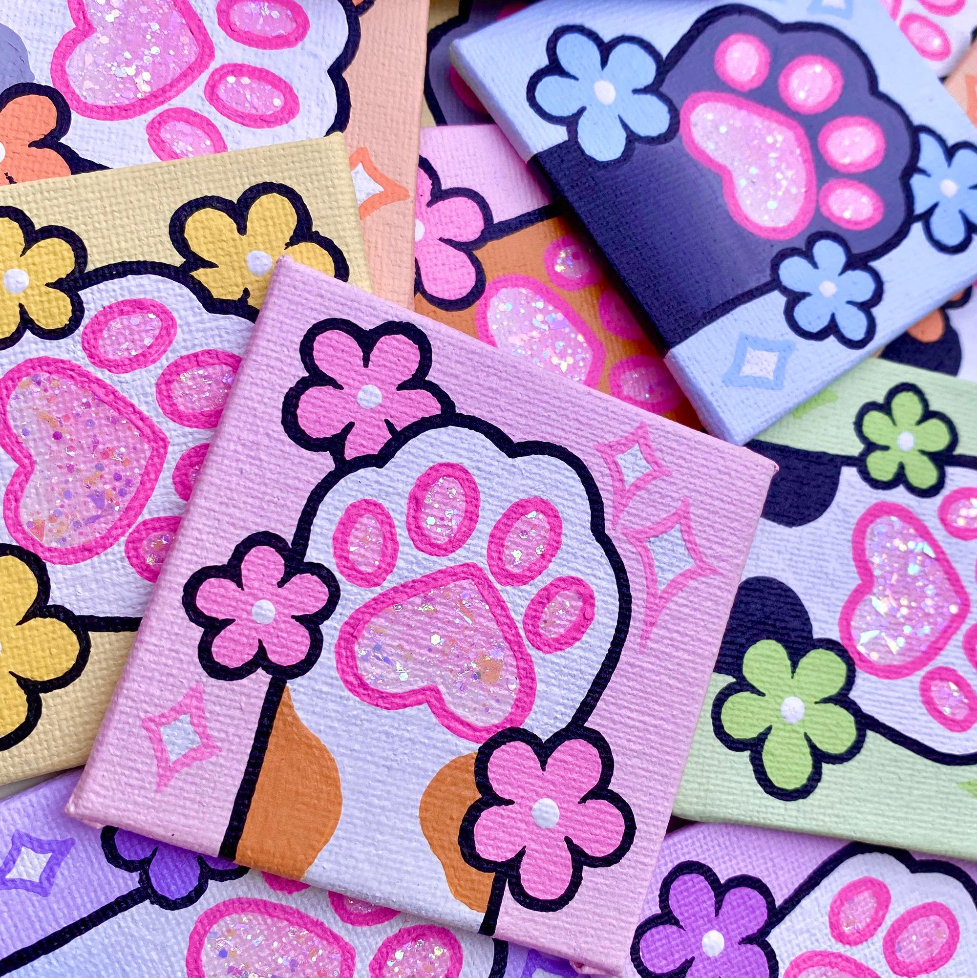 These are 2.5x2.5" original paintings on canvas panel. Made with acrylic paint and holographic glitter paint on the toe beans! Sealed with a gloss varnish. Signed on the back.